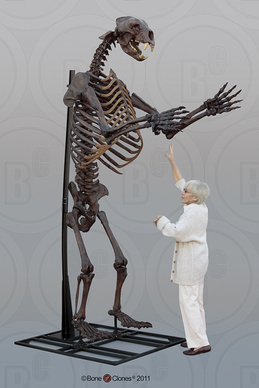 Arctodus simus (Cope-1897), the Short-Faced Bear, became extinct approximately 11,000 years ago. This individual died approximately 28,000 years ago and was found in Alaska. Other specimens have been found in several locations from Mexico to Alaska. These bears were extremely large and weight estimates have been in excess of 1300 lbs. They are considered the largest predatory mammal to have roamed the earth. This specimen was approximately five feet at the hip and stood about 12 feet tall. We are grateful to the Babiarz Institute of Paleontological Studies for the opportunity to cast this individual.