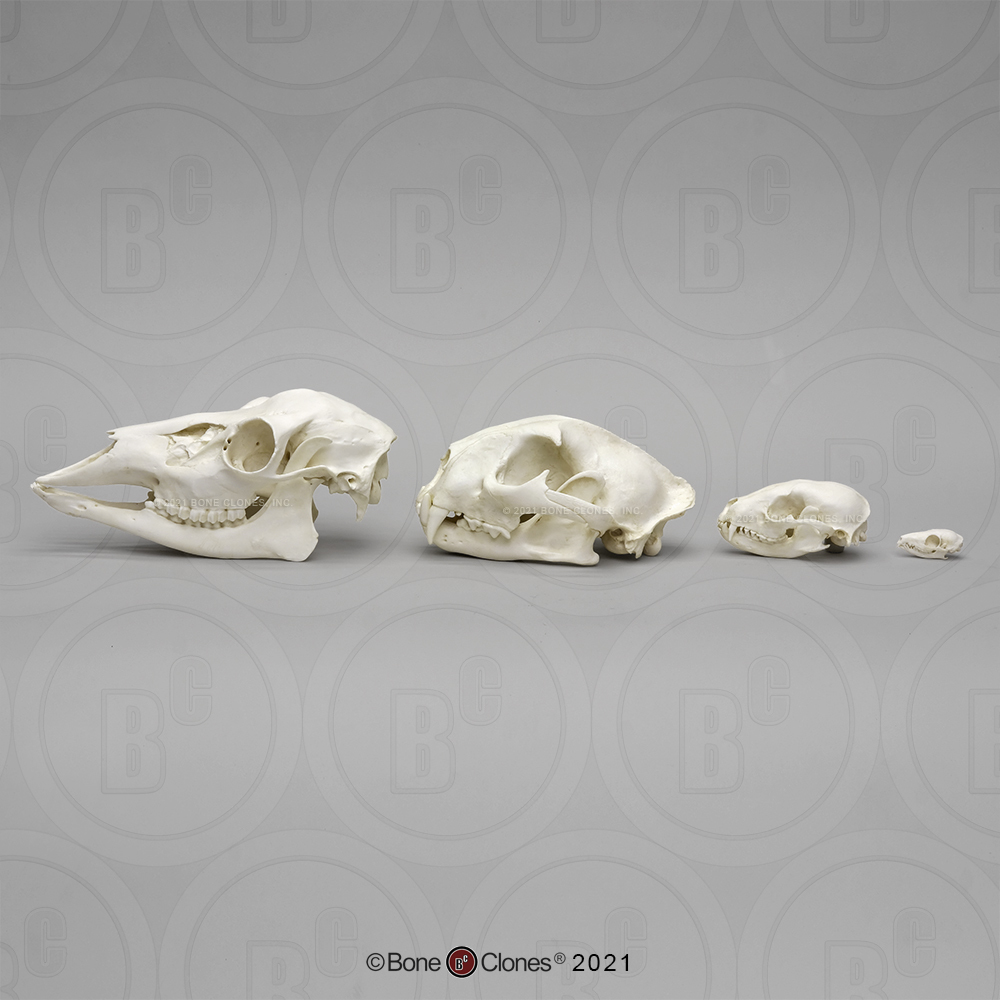 Bone Clones has created a set of four mammal skulls that can be used to identify, compare, and contrast the characteristics and features that help to place an animal skull into a dietary group. Featuring four types of dietary classifications, the set can be used to explore a range of concepts, from linguistic, morphological, and scientific to artistic.
