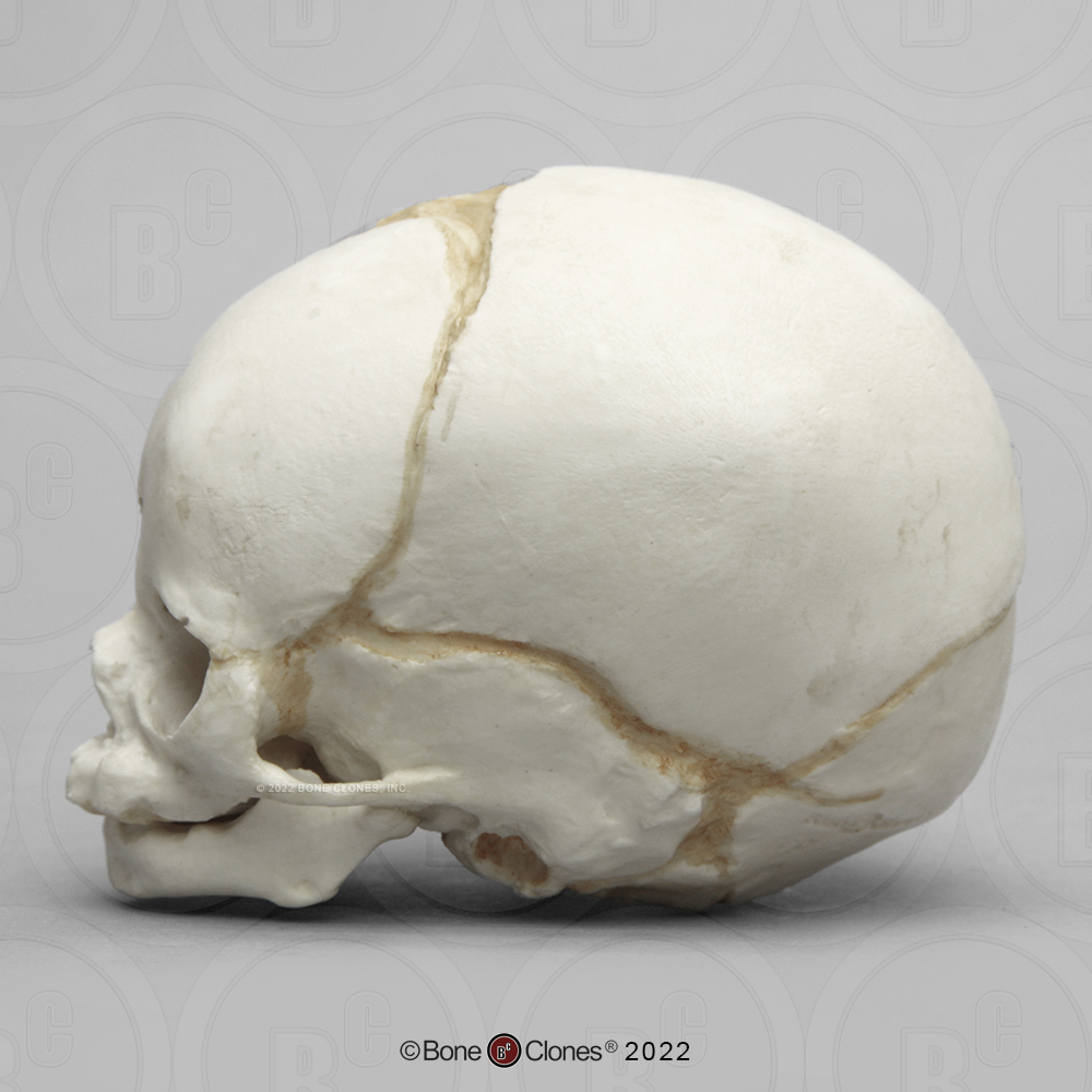 Estimated to be 32 weeks old, this skull exhibits characteristics of prenatal development. This reproduction is also offered as part of three chronological sets, BC-182-SET, BC-194-SET and BC-228-SET. 1-part skull (jaw glued to cranium).