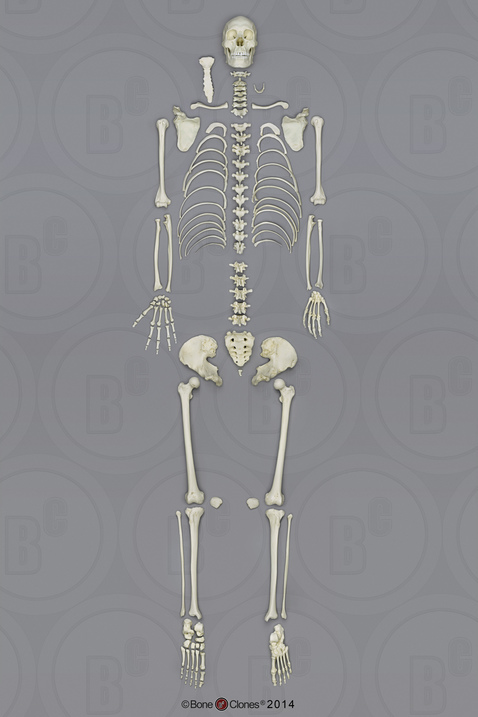 This is an excellent example of an adult male skeleton. With the diminished availability of natural bone skeletons, Bone Clones® products are increasingly used in advanced anatomical and osteological instruction. Features of the pelvis (the most reliable indicator of sex) are consistent with a determination of male. Determination of stature (based on measurements of the long bones in the right arm and leg) suggest that the individual stood between 5' 8" to 6' 1½".