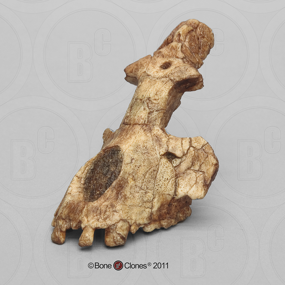 28-29 MYA. The partial cranium of a fossil primate Saadanius hijazensis was discovered by paleontologist Iyad Zalmout in 2009 in the Shumaysi Formation in the Al Hijaz province in western Saudi Arabia and was excavated by a joint Saudi Geological Survey and University of Michigan team. Analysis indicates that it was an adult male of medium size, weighing about 33-44 lbs. Zalmout and colleagues (2010) place the fossil within the Catarrhini (the group comprising both cercopithecoids-Old World monkeys and apes) and differentiate it from other Oligocene Afro-Arabian finds with the designation of a new superfamily. While primitive catarrhine features predominate the cranium, the presence of a tubular ectotympanic-a bony ear tube- led Zalmout et al. to consider this an advanced stem catarrhine, suggesting closer ancestral tries to crown (extant) forms. Saadanius is also significant as it helps to fill a gap in the fossil record between 23-30 mya, which is the time during which Old World monkeys and apes diverged. As such, this find may be important to debates concerning both the features that characterized the last common ancestor of Old World monkeys and apes (the presence of a longer monkey-like versus shorter ape-like faces) and the timing of the split between the two (after 29 mya). Bone Clones© recreated this partial cranium based on the latest literature, including descriptions, measurements and photographs.