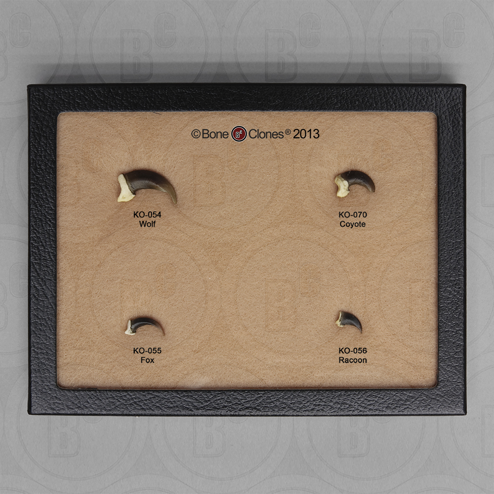 This set of four claws includes Bone Clones® replicas of wolf, fox, raccoon and coyote. Perfect for comparative study and displayed in a glass fronted riker box...and yes, we know that raccoons, though carnivores, are not canids (they're in their own family, Procyonidae). We included the raccoon claw because we thought it was interesting in comparison to the other three canid claws. A copy of the photograph shown here with the claws identified will be sent with your order. The claws are not labeled in the riker box.