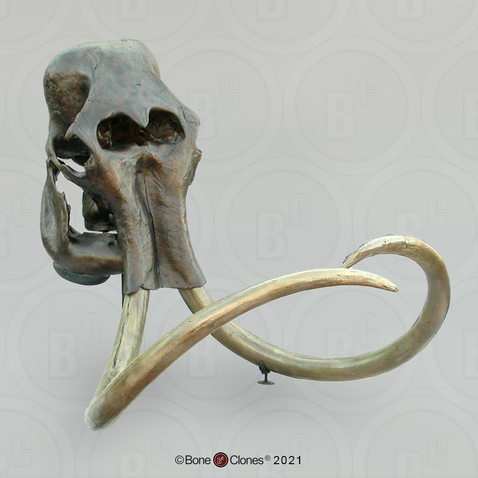 Mammoths belong to the order Proboscidea, which also includes the American mastodon and the African and Indian elephant. The larger species of mammoth, which appeared about 4 MYA, became extinct about 10,000 years ago, while some of the smaller species existed until about 4,000 years ago. The specimen here is a woolly mammoth discovered in Alaska. The woolly mammoth is well-studied, as several well-preserved specimens have been found; it also appears in cave paintings. The woolly mammoth was similar in size and height to the Indian elephant but had a distinctive slope to its back as a result of its relatively shorter hind legs. Its long thick black hair and underwool give rise to its name. Its tusks, which they may have used to dig through the snow to get to vegetation, measured up to 13 feet and are actually very long incisors that continued to grow throughout the mammoth's life. Its teeth also appear to have been specially adapted to the frozen tundra, with a greater number of plates and a higher crown than the teeth of other mammoths. Chosen for its quality and size, our specimen was probably a female. The smaller size makes it more manageable for teaching as well as exhibits. We are grateful to the Babiarz Institute of Paleontological Studies for the opportunity to cast this individual. The tusks are also available individually and as a pair. Please see below. A custom display stand is available separately below.